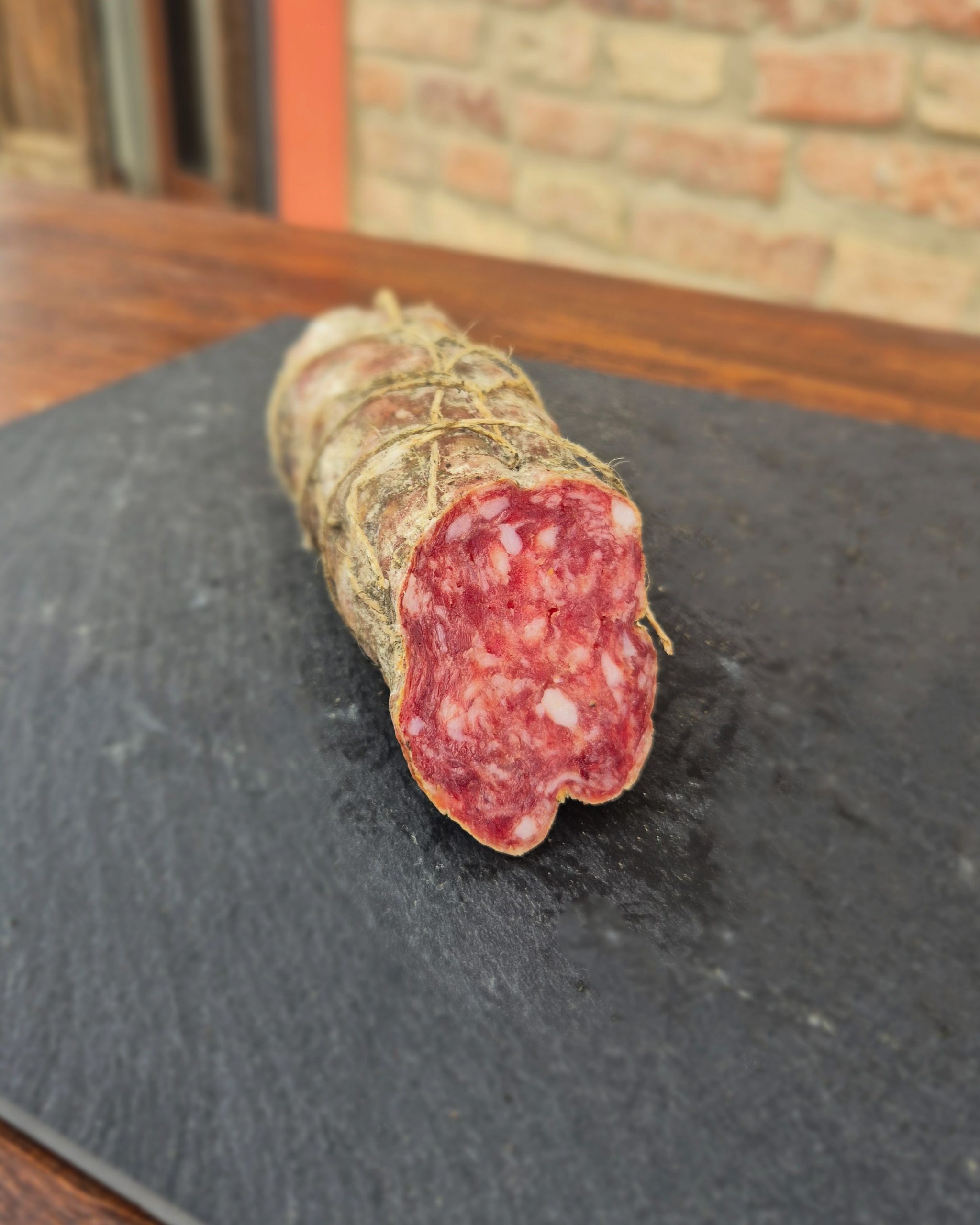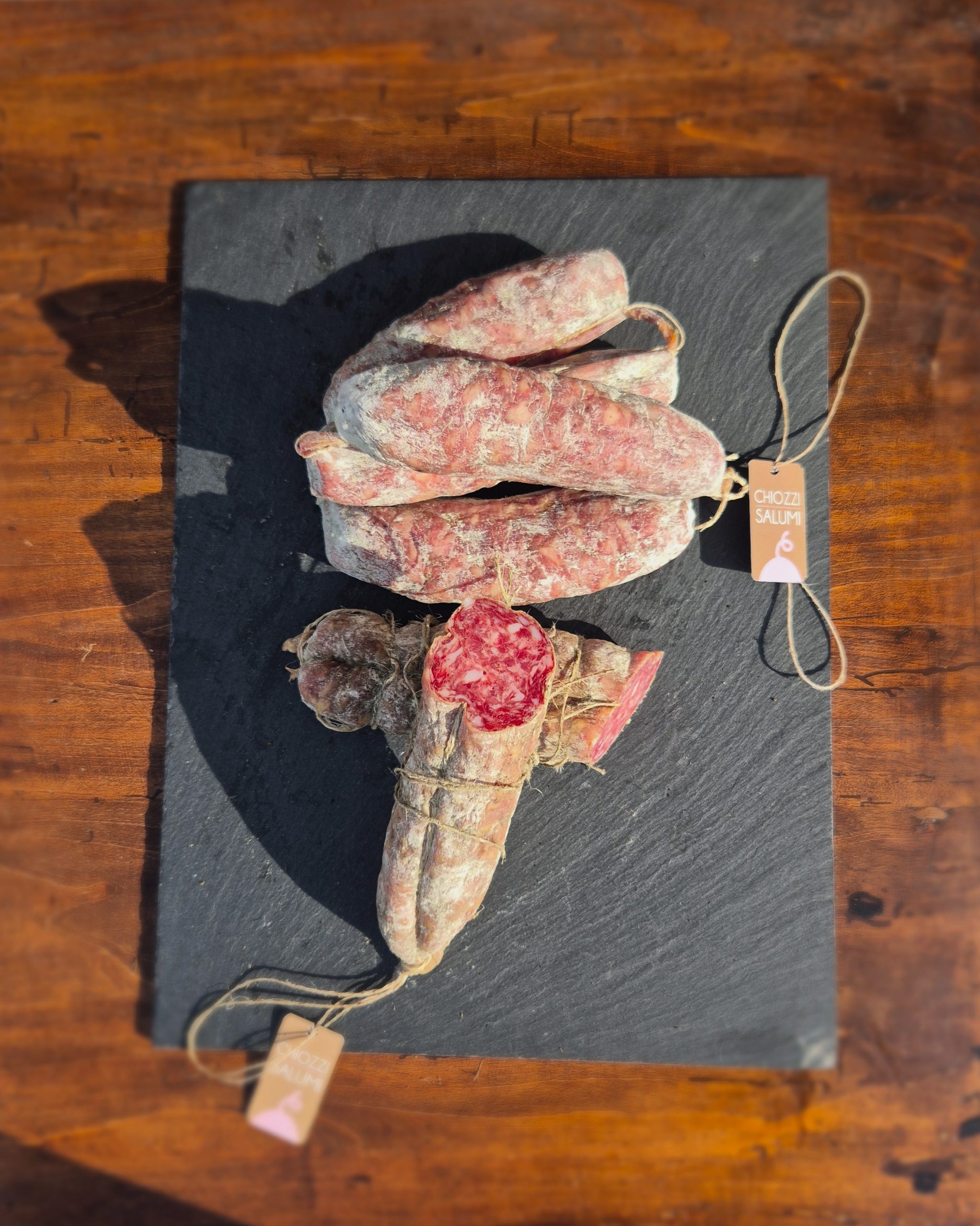 L’impasto del Salamino Gustoso utilizza le parti piรน pregiate del suino, come fiocco e culatello, a cui si aggiungono sale, vino e una concia preparata con aglio in spicchi, macinato e lasciato in infusione con il vino, poi filtrato. L’impasto viene insaccato in un budello naturale e legato a mano dai nostri norcini. Questa lavorazione conferisce al prodotto un gusto pieno ma fine.ย L’impasto รจ lo stesso del Salame Gustoso; a distinguerli sono dimensioni e tempi di stagionatura. Il Salamino Gustoso matura in celle dedicate che riproducono le condizioni delle cantine tradizionali. Importante ricordare che le dimensioni del prodotto influenzano la consistenza finale.
